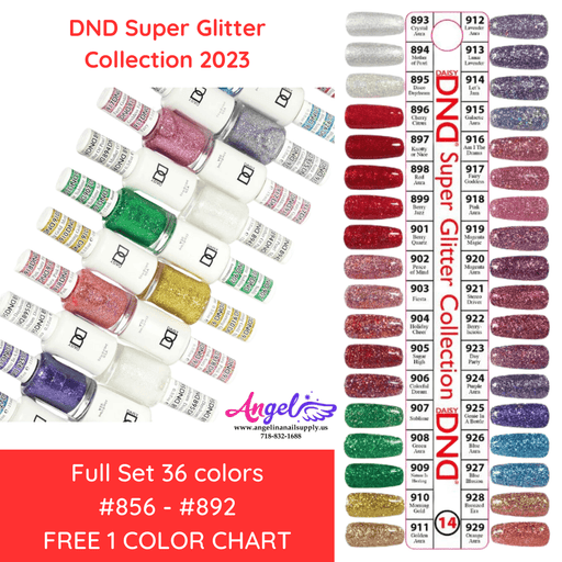 View full detailsDND Collection #14 Super Glitter (Full Set 36 colors #893 - #929 DND14) NOTE: if you want the color chart (swatch), please include the note. Embra...